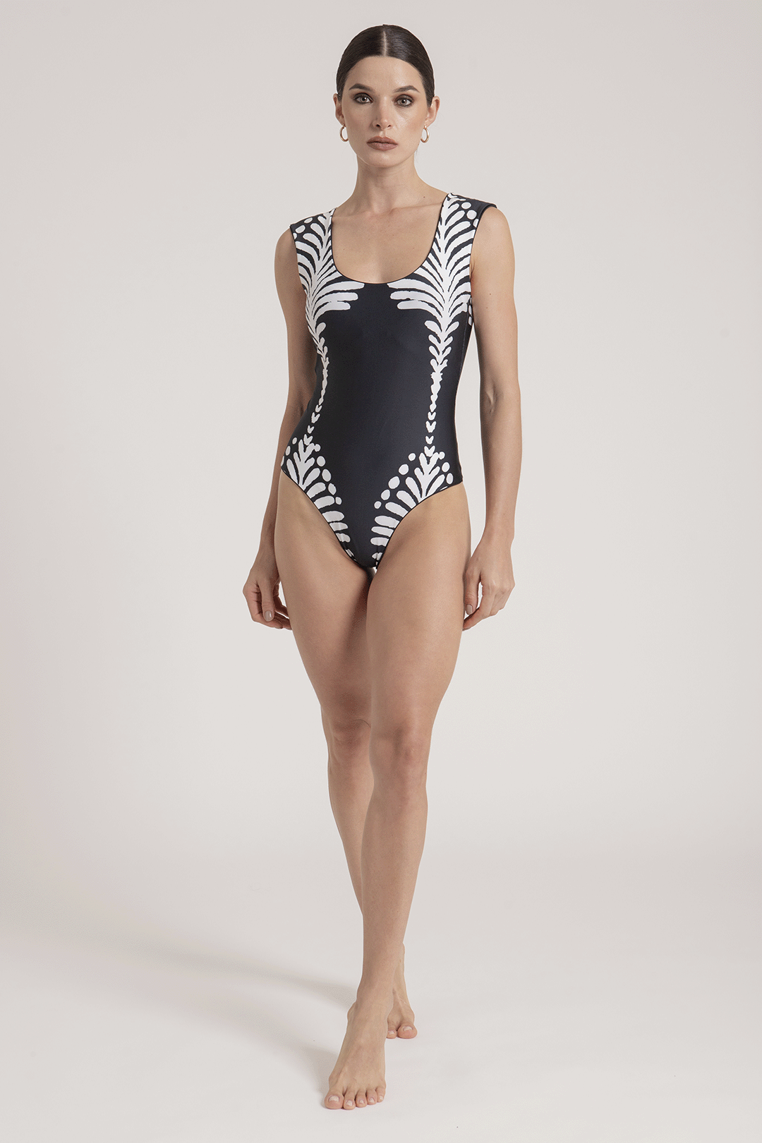 Su print de palmas en blanco y negro, pintado a mano y cuidadosamente posicionado, evoca el equilibrio entre lo vivo y lo eterno.